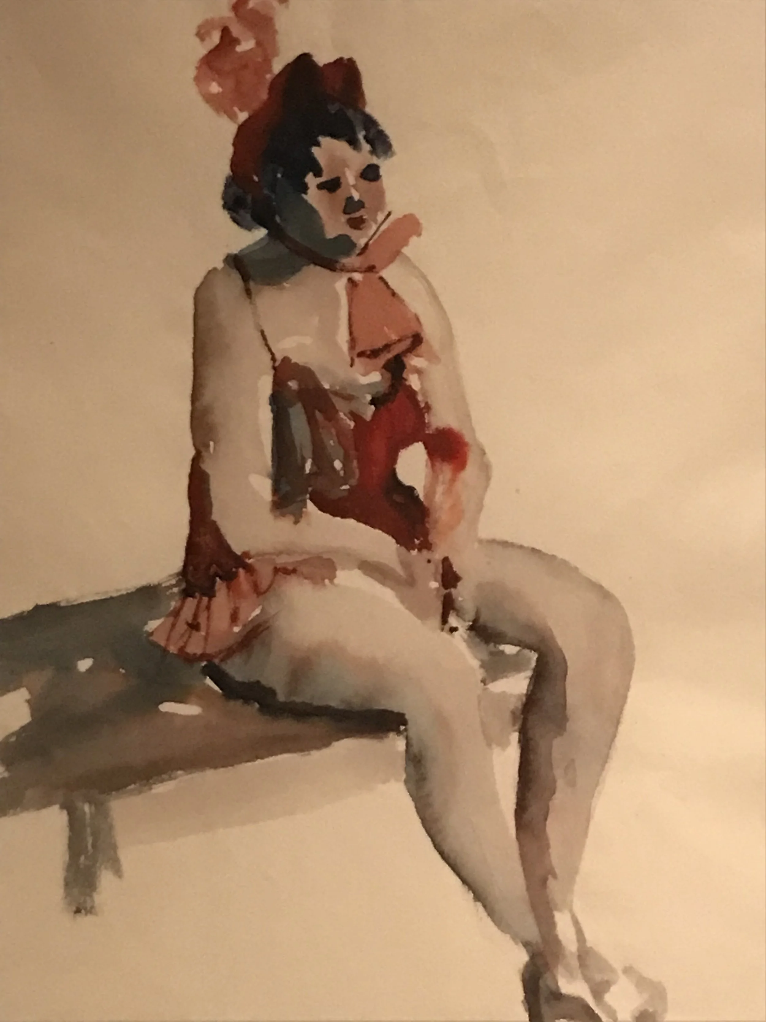 Dans la première section, il s'agit surtout de représentations de jeunes femmes participant à des revues. Ces étoiles d'un jour ou plus deviennent les principaux modèles des oeuvres d'Amable Arias qui mêlent à un érotisme subtile, un réalisme sincère, car les personnes ne prennent pas la pose. Il s'agit en vérité d'instants volés par la grande capacité d'Amable Arias à travailler sur le vif. L'artiste ne se contente pas de montrer ces femmes à l'heure de gloire sur scène, il les représente tout aussi bin après le spectacle, ou à un moment de repos. Amable Arias en montre l'ombre et la lumière pour saisir la vie réelle. Aussi, même si nous ne savons plus rien de ces vedettes de jadis, nous nous y attachons vite en devinant la gloire et la joie qui les auréolaient. Dans le même esprit, la deuxième section met en avant les hommes, comédiens ou acteurs, qui assurèrent les représentations au Théâtre Principal de Donostia. Les tonalités rouge, bleu et verte des aquarelles répondent aux dessins à l'encre et au crayon. La section suivante se concentre davantage sur d'autres protagonistes essentielles, à savoir la musique et la danse. Le Théâtre Principal accueillait de nombreux types de spectacles de musiques et de danses, à commencer par les ballets, mais aussi beaucoup de flamenco. La dernière section attire notre attention sur le théâtre même et les nombreuses personnes appelées à y travailler. On découvre alors des vues des différentes éléments de l'édifice, parmi une foule silencieuse de petites-mains sans lesquelles les célébrités n'auraient jamais pu monter sur scène et faire rêver le public. Par exemple, nous découvrons les couturières et les tailleurs qui s'affairaient autour des costumes des étoiles d'un soir.