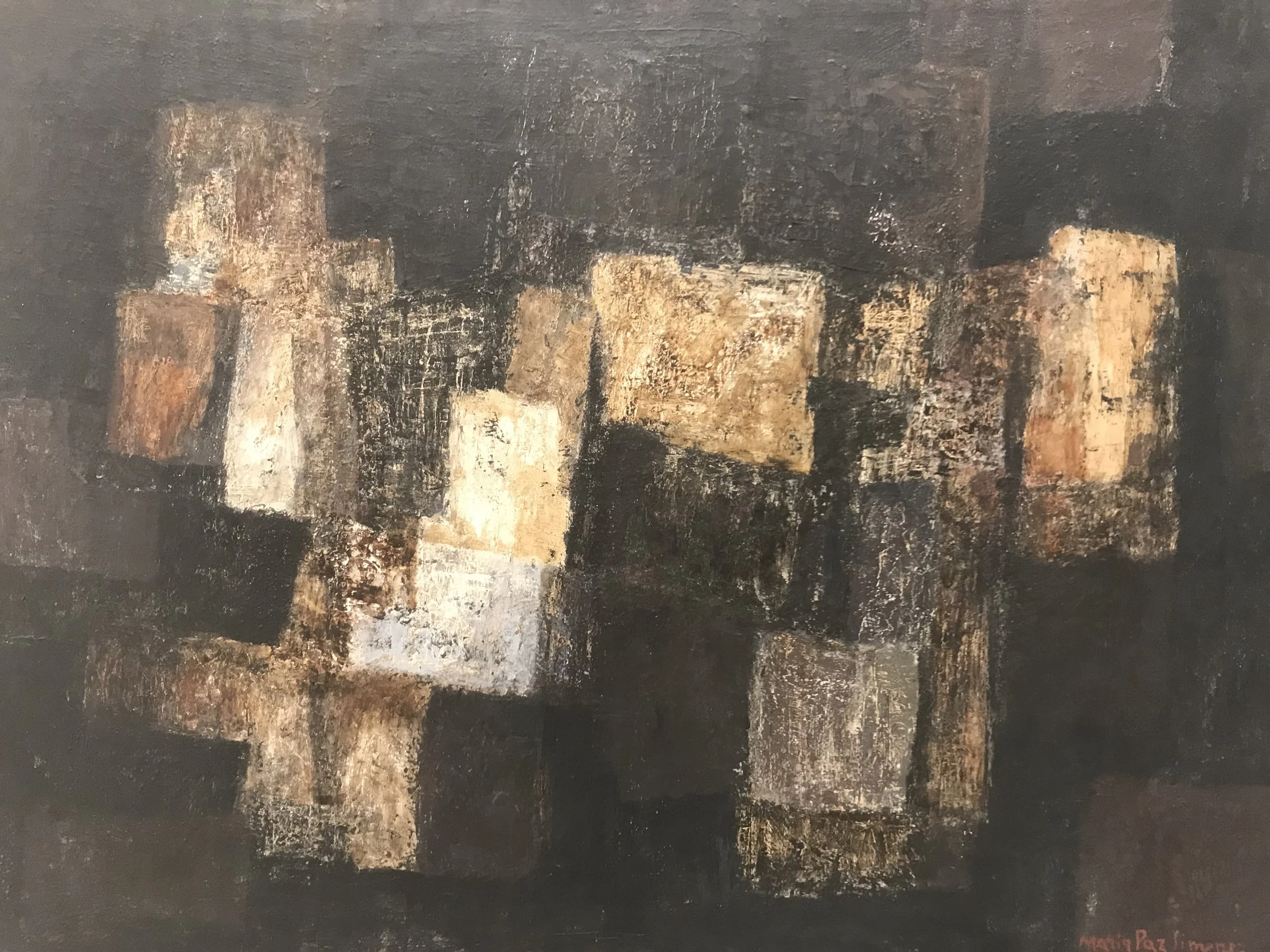 La grande salle du Kubo présente d'abord ses premières oeuvres inspirées par le surréalisme. Réalisés à Buenos Aires, ces tableaux ambigus et mystérieux reflètent les avant-gardes de l'époque en Argentine. Dans la mezzanine sont rassemblées les "Monigotes" exécutées à son retour à Donostia. Ces représentations colorées et faussement naïves de jeunes filles ou d'adolescentes souvent isolées du monde semblent faire écho à l'atmosphère oppressante du franquisme. De retour dans la grande salle, la section "amie de l'expérimentation" met en avant ses premiers travaux abstraits, parmi les premiers de l'état espagnol, à côté d'autres oeuvres plus figuratives, notamment des natures mortes post-cubistes. A partir de 1957, des oeuvres "informelles" sont nimbées d'une abstraction poétique et animées par des émotions sourdes. Ses dernières oeuvres explorent l'espace par le biais d'abstractions monochromes. L'énergie de ces toiles prend source dans des pliures ou d'autres formes placées au centre des tableaux où se croisent l'univers anonyme et la solitude existentielle. Sans cesse, les recherches plastiques de Maria Paz Jimenez ont interrogé notre situation face au mystère de l'univers. Cette importante rétrospective qui commémore les cinquante ans de la disparition de Maria Paz Jimenez rend justice à l'artiste basque la plus importante du XXème siècle.
