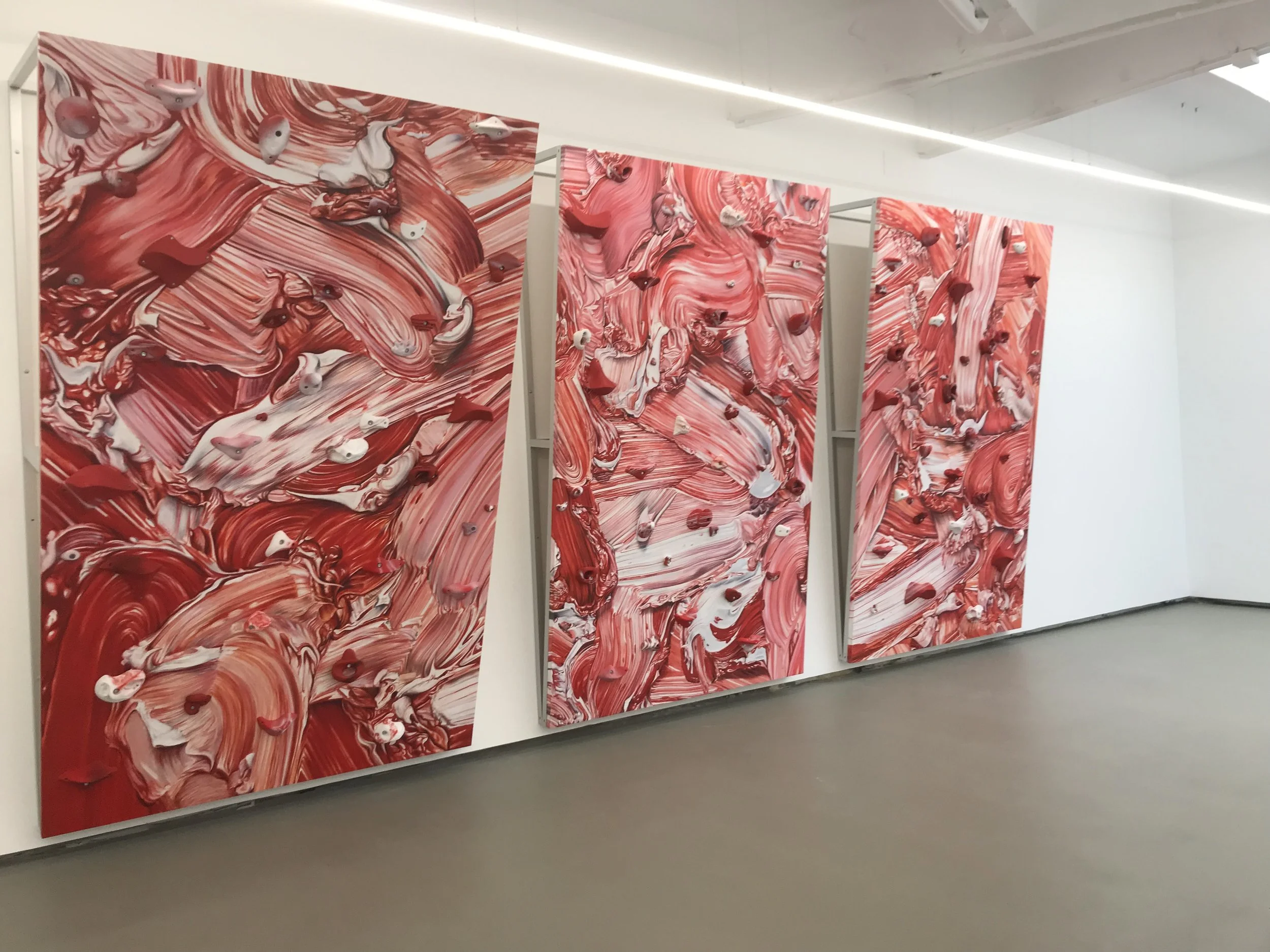 Ainsi le dispositif de son triptyque monumental correspond à la photo d'une portion de peinture agrandie à plusieurs échelles, de sorte que le regard y perçoit une multiplicité d'images en se déplaçant de droite à gauche, de prêt ou de loin. Les variations de l'oeuvre obligent le spectateur à projeter ses désirs pour lui donner un sens et saisir l'apparition de figures.