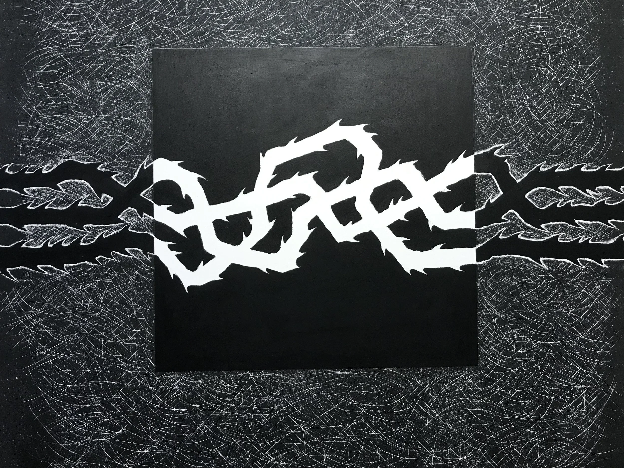 Avec le végétal, la blessure et les glyphes, les mêmes préoccupations reviennent sous une forme différente. Autre élément clé du travail : ses tableaux explorent les oppositions. Le triptyque réalisé lors du confinement nourrit des lueurs d'espoirs dans un espace carcéral. De la même façon, l'architecture puissante, sombre et rectiligne du château de Bidache se définit par opposition au bleu du ciel et aux courbes libertaires des nuages. Et si l'on reconnait le Mondarain, l'artiste garde les barres de la haute tension visibles depuis chez elle. Quant à ses ronces, naturelles et agressives, elles renvoient à des blessures inconscientes et vives.